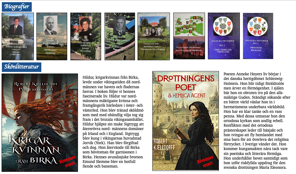 The start led to a passion to write exciting stories in a historic environment. The two first novels in that category are published in 2026 in cooperation with among others Writers Corner Stockholm, Manusbearbetning, Ordmakare, Lava and Freja Publishing Services.
